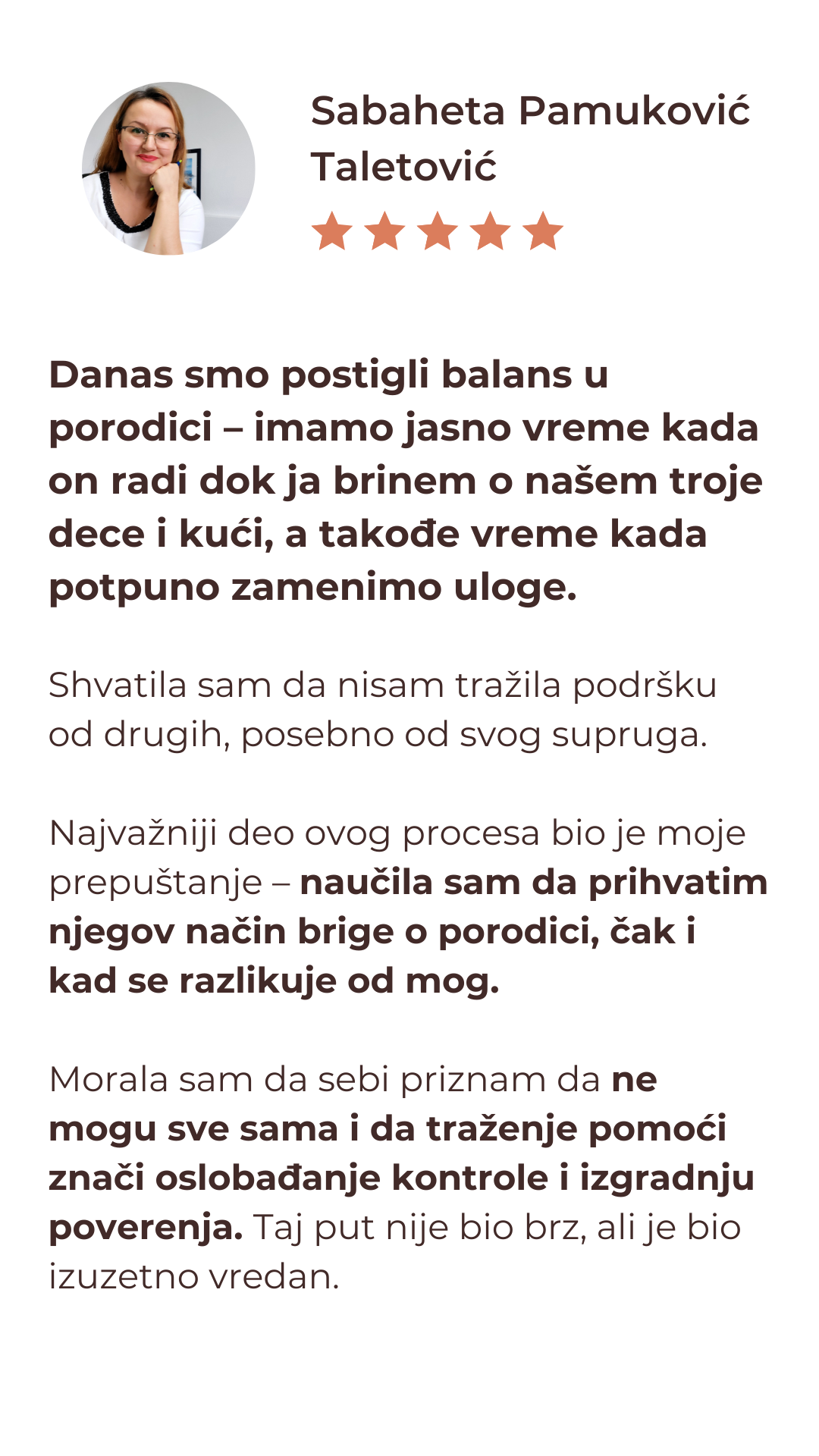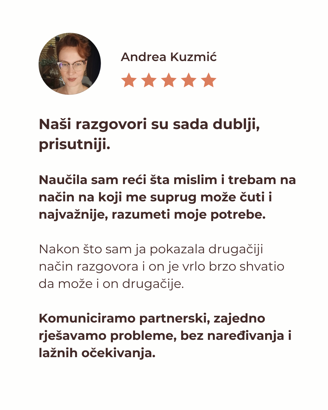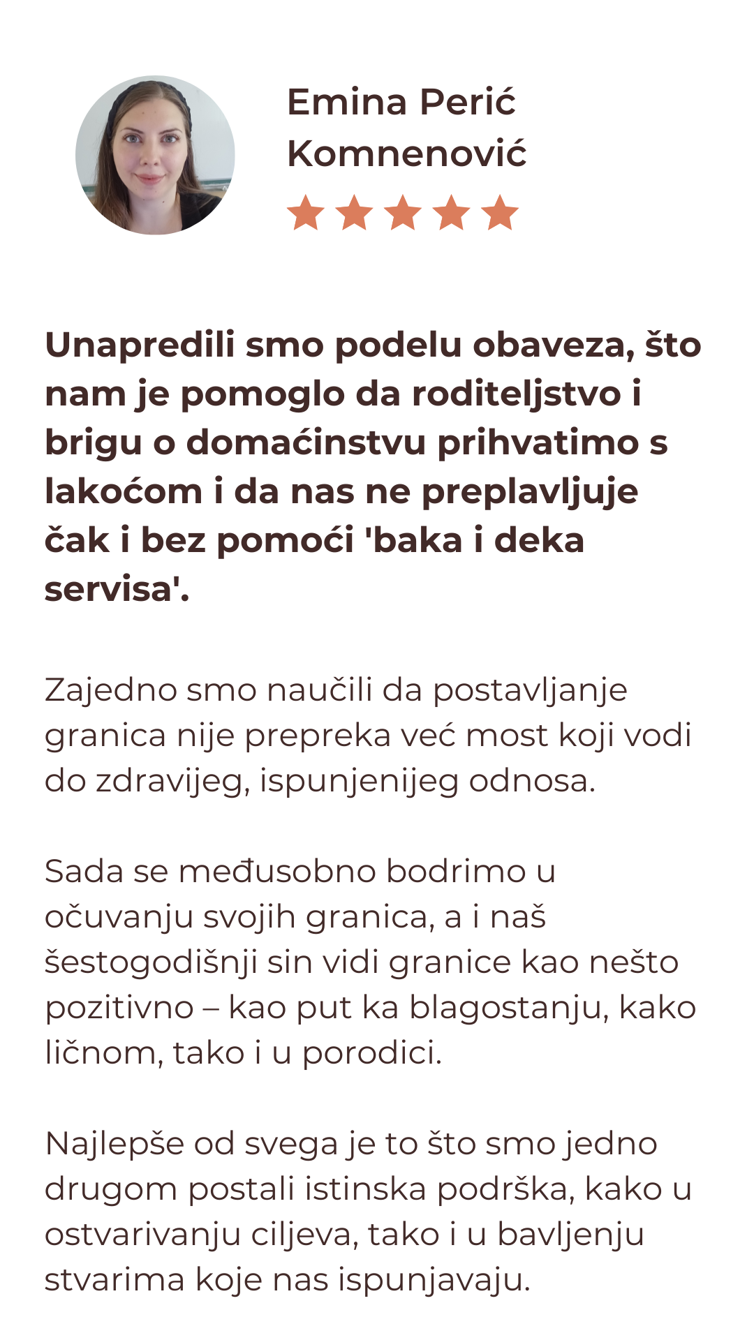 Za primenu saveta koje delim sa tobom ti ne treba dodatno vreme. Vi već komunicirate i dogovarate se, samo što ćete to raditi efikasnije i uz više podrške i razumevanja jedno za drugo - nakon primene kursa.