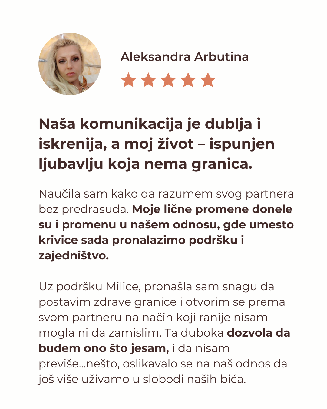 Uvek postoji bar još jedna opcija koju nismo probali. Radujem se da tebi pomognem da otkriješ tvoje neistražene opcije i da zdravim granicama kreiraš više mira i ljubavi sa partnerom kog si birala!