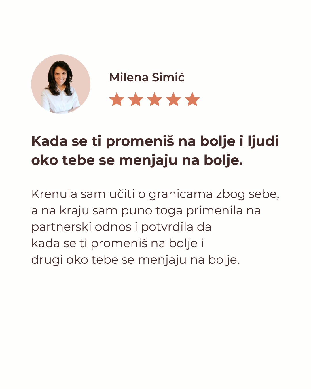 Nakon 15 godina u oblasti psihologije i psihoterapije, dugogodišnjeg rada sa klijentima na temu partnerskih odnosa i postavljanja granica, kreirala sam kurs Granice u partnerskom odnosu koji sadrži destilovana, praktično primenjiva znanja koja će transformisati način na koji pristupaš odnosu, a time i šta dobijaš u odnosu i kako se sa partnerom osećaš.